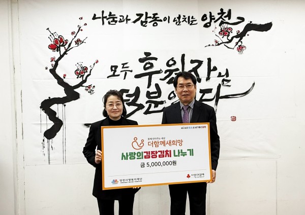 양천구에 주사무소가 있는 사단법인 더함께새희망이 동절기를 맞이하여 저소득 어르신들께 김장김치를 지원하고자 후원금을 양천사랑복지재단에 전달했습니다.