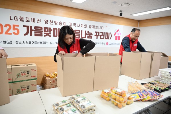 LG헬로비전 양천방송 가을맞이 마음나눔 꾸러미 전달식 페이지 정보 작성자 양천사랑복지재단 작성일2025-11-07 13:17 조회13회 댓글0건 관련링크 이전글 다음글 목록 본문 2025년 10월 31일 서서울어르신복지관에서 LG헬로비전 양천방송 후원으로 마음나눔꾸러미(식품 및 생활용품) 100세트 만들기 봉사활동을 진행하였습니다. LG헬로비전 양천방송은 양천사랑복지재단에 후원금 500만원을 후원해 주셨고, 서서울어르신복지관은 행사 진행을 맡아 주셨습니다. 후원과 봉사활동을 해주신 LG헬로비전 양천방송과 서서울어르신복지관에 감사드립니다. 댓글목록 등록된 댓글이 없습니다. 이전글 다음글 목록