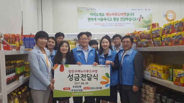 -6월- 우리은행 우장산역지점, 사랑의 성금 전달 페이지 정보 작성자 양천사랑 작성일2017-06-26 17:46 조회918회 댓글0건 관련링크 이전글 다음글 목록 본문 \r\n 6월 26일, 우리은행 우장산역지점은 양천사랑복지재단(이사장 김동엽)의 연계를 통해 양천구해누리푸드마켓(소장 최재란)에 성금 300,000원을 전달하였습니다. 기부된 성금은 양천구해누리푸드마켓 이용자들을 위해 사용될 예정입니다.\r\n 댓글목록 등록된 댓글이 없습니다. 이전글 다음글 목록