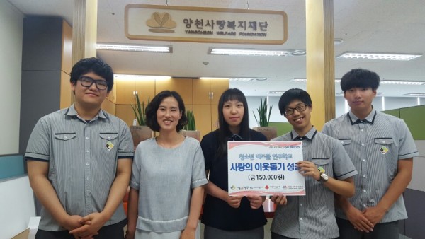 | \r\n 5월 22일, 청소년 비즈쿨 연구학교 서울금융고등학교(교장 박상철) 통합 바리스타 동아리는 중소기업청의 후원으로 진행된 재래시장 내 커피 판매 수익금 150,000원을 양천사랑복지재단(이사장 김동엽)에 전달하였습니다. |