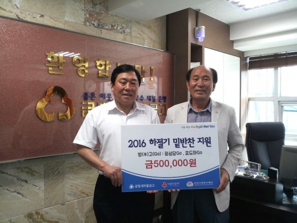 금빛새마을금고는 2016 저소득가정 하절기 밑반찬 지원사업 "빙(氷)고(GO)"의 밑반찬 구매를 위한 성금 500,000을 양천사랑복지재단에 기부하였다. 전달받은 성금으로 구매한 밑반찬은 7월 29일 부터 8월 6일까지 각 동의 자원봉사 캠프장 및 상담가, 청소년자원봉사자 등을 통해 전달될 예정이다.