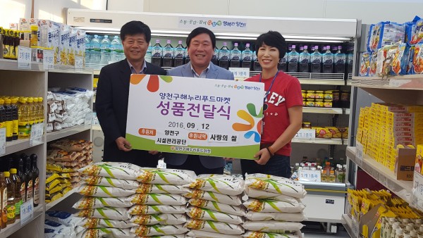 -9월- 양천구시설관리공단, 추석맞이 성품 전달식 페이지 정보 작성자 양천사랑 작성일2016-09-13 10:32 조회752회 댓글0건 관련링크 이전글 다음글 목록 본문 \r\n\r\n 양천구시설관리공단(이사장 김종구)은 추석을 맞아, 양천사랑복지재단의 연계로 쌀 4kg 80포를 양천구해누리푸드마켓에 전달하였습니다. 기부된 쌀은 양천구해누리푸드마켓 이용자들에게 전달될 예정입니다.\r\n 댓글목록 등록된 댓글이 없습니다. 이전글 다음글 목록