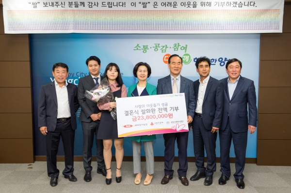 ㈜태양자동문의 김완중 대표는 23,800,000원 상당의 쌀 화환을 양천사랑복지재단에 기부했습니다. 김완중 대표는 첫째 딸 결혼식에 보내지는 화환 대신 쌀 화환을 보내줄 것을 제안했고, 이에 결혼 축하 쌀 화환 기부금이 모아진 것입니다. 양천사랑복지재단은 전달된 쌀 화환 기부금을 관내 복지사각지대 이웃에게 사용할 예정입니다.