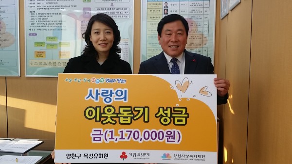 -12월- 목성유치원 사랑의 이웃돕기 성금 전달식 페이지 정보 작성자 양천사랑 작성일2015-12-15 17:34 조회817회 댓글0건 관련링크 이전글 다음글 목록 본문 양천구 신정동에 위치한 목성유치원에서 교직원분들이 모아주신 성금을 지난 11일(금), 양천사랑복지재단에 전달해 주셨습니다.이 성금은 앞으로 양천구 저소득주민분들을 위해 소중하게 쓰일 예정입니다. 감사합니다. 댓글목록 등록된 댓글이 없습니다. 이전글 다음글 목록
