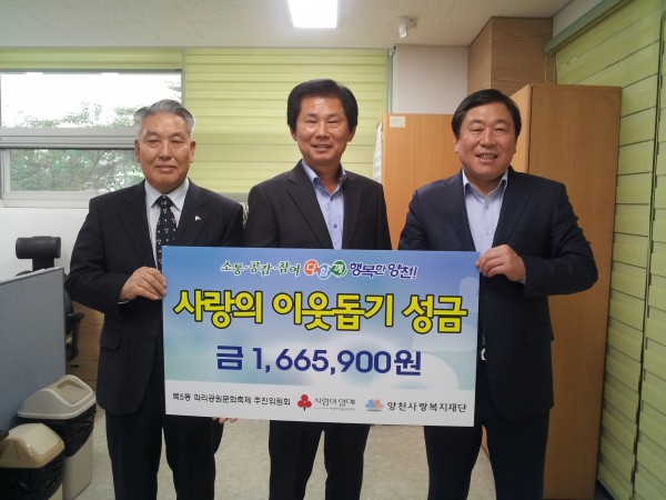 -11월- "사랑의 이웃돕기 성금" 전달식 페이지 정보 작성자 양천사랑 작성일2015-11-06 17:41 조회635회 댓글0건 관련링크 이전글 다음글 목록 본문 지난 2015년11월2일(월), 목5동 파리공원문화축제 추진위원회의 "사랑의 이웃돕기 성금" 이 양천사랑복지재단(이사장 김춘석)에 전달 되었습니다. 양천사랑복지재단은 양천구의 소외되고 어려운 지역주민들을 위해 더욱더 열심히 노력하겠습니다. 감사합니다. 댓글목록 등록된 댓글이 없습니다. 이전글 다음글 목록