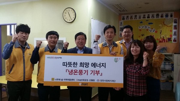 2015.10.21(수) 양천사랑복지재단(이사장 김춘석)의 연계로 이마트 목동점*신월점 "냉온풍기 전달식"이 양천구 목동중앙북로에 위치한 나무와 숲 지역아동센터에서 진행 되었습니다. 열약한 환경속에서 아이들을 위해 노력하시는 선생님들과 센터를 이용하는 아이들에게 큰 선물이 되었습니다.