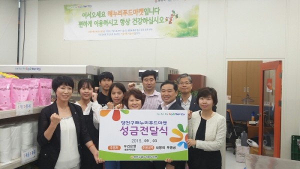 우리은행 등촌역지점(지점장 강성문)은 지난 9월 3일, 양천사랑복지재단(이사장 김춘석)의 연계로 양천구해누리푸드마켓(소장 최재란)에 성금 300,000원을 전달하고, 성품정리 등 봉사활동을 진행하였습니다.