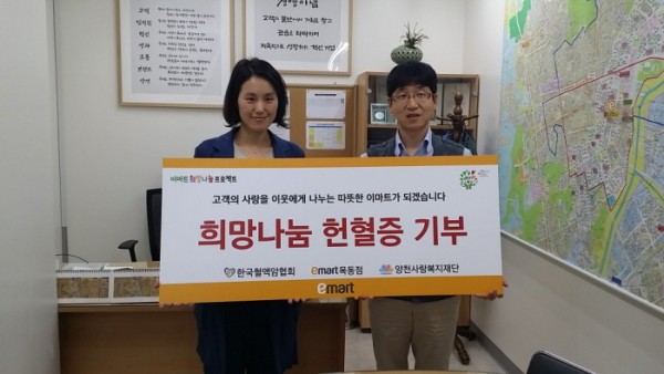 이마트 목동점, 한국혈액암협회에 헌혈증 기부 페이지 정보 작성자 양천사랑 작성일2015-09-10 19:50 조회634회 댓글0건 관련링크 이전글 다음글 목록 본문 지난 9월 9일, 양천사랑복지재단(이사장 김춘석)의 연계로, 이마트 목동점(지점장 김대규)은 희망헌혈 캠페인을 통하여 모은 헌혈증 70여장을 한국혈액암협회에 기탁하였습니다. 댓글목록 등록된 댓글이 없습니다. 이전글 다음글 목록