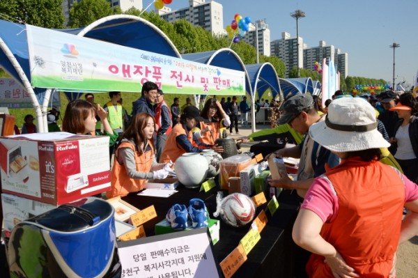 지난 5월 16일, 신정교 아래 해마루축구장에서 양천구민의날 기념 걷기대회가 열렸습니다. 양천사랑복지재단(이사장 김춘석)은 양천구 18개동 주민센터, 구청 등을 통하여 사전에 접수한 애장품을 판매하고, 경매를 진행하였습니다. 판매 수익금 전액은 양천사랑복지재단을 통하여 양천구 관내 복지사각지대 지원사업에 쓰일 예정입니다. 당일 진행에 도움을 주신 모든 분들께 감사드립니다.