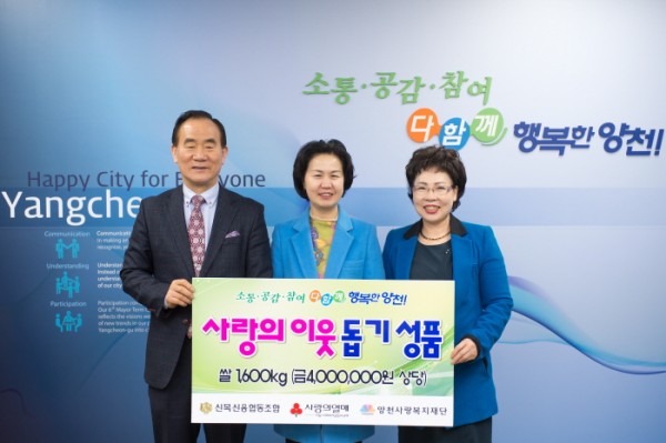 신목신용협동조합(이사장 이보란)은 2월 26일, 양천사랑복지재단(이사장 김춘석)에 쌀 1,600kg(금4,000,000원상당)을 기탁하였습니다. 기탁된 쌀은 목1동, 신정2동, 신정4동 경로당으로 전달되었습니다. 지속적으로 지역사회를 위한 나눔활동에 동참해주시어 감사드립니다.