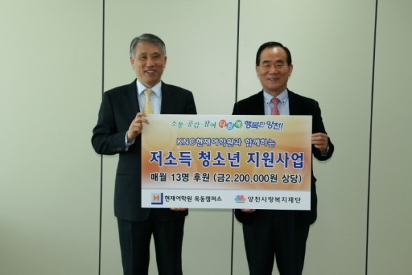 KNC현재어학원 목동캠퍼스(이사장 김낙찬)은 지난 3월 25일, 양천사랑복지재단(이사장 김춘석)을 통하여 양천구 관내 저소득 초등학생 지원을 위한 결연후원금 및 무료수강권을 기탁하였습니다. 현재어학원은 4월부터 초등생 자녀를 둔 저소득 10가구와 결연을 맺어 매월 후원(1인당 100,000원)하고, 관내 초등학생 중 어려운 가정형편으로 인하여 사교육 지원이 필요한 학생 5명을 추천받아 매월 무료수강권(1인당 40만원 상당)을 지속적으로 지원할 예정입니다.