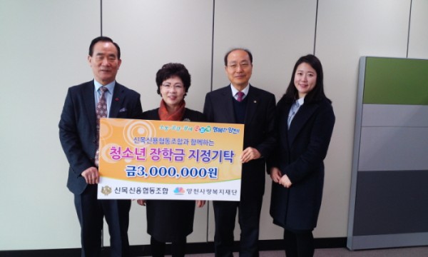 신목신용협동조합(이사장 이보란)은 지난 1월 30일, 양천사랑복지재단(이사장 김춘석)에 청소년 장학금 3,000,000원을 지정기탁 하였습니다.