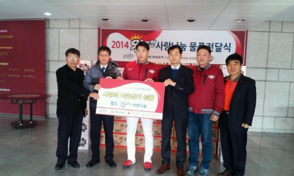 지난 12월 9일, 넥센히어로즈 프로야구단은 목동야구장에서, 양천사랑복지재단(이사장 김춘석)에 2014시즌 '왕뚜껑 홈런존'에 적립된 성품을 전달하였습니다. 이 날 기탁된 성품은 부숴먹는 라면(203박스), 컵라면( 227박스) 및 기타 식품 등이며, 이는 양천구내 지역아동센터협의회 등에 전달되었습니다. 아이들에게 따뜻한 마음을 표현해주셔서 감사드립니다.