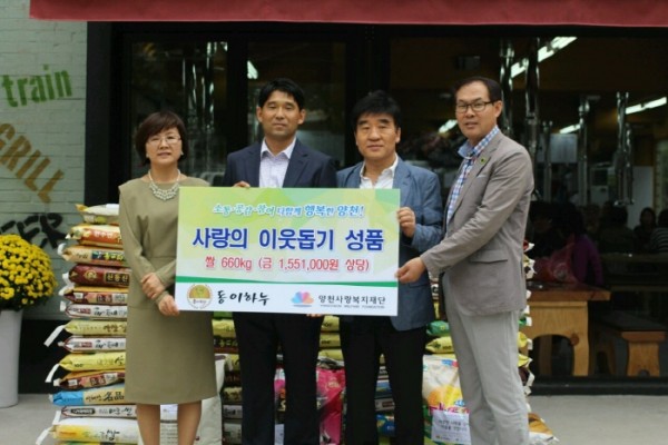 목4동에 위치한 동이하누는 우리 재단의 연계로 지난 10월 2일, 개업기념 쌀 660kg을 목동, 신정종합사회복지관에 기탁하였습니다. 이날 기탁된 성품은 복지관 경로당 활성화사업 및 재가어르신 지원에 쓰일 예정입니다. 새로운 시작을 나눔으로 동참하여 주시어 감사드립니다.