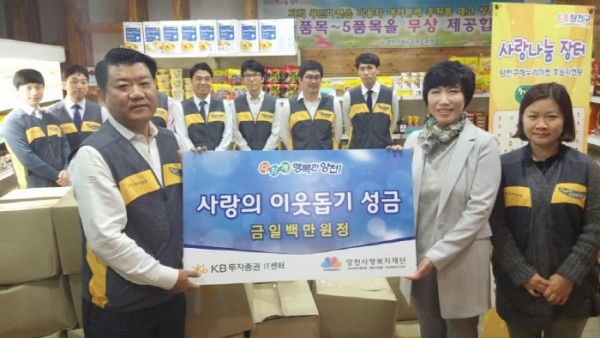 10월 21일 KB투자증권 IT센터(센터장 한동우)는 해누리푸드마켓에 성금 1,000,000원을 기탁하고, 물품정리 등 봉사활동을 진행하였습니다. 궂은 날씨에도 바쁜 시간을 쪼개어 봉사활동에 열정적으로 참여해주신 IT센터 임직원여러분께 진심으로 감사드립니다.