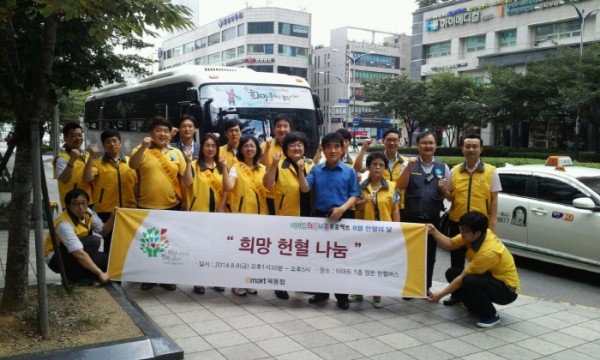 이마트 목동점과 신월점 직원들은 8월 8일 이마트 목동점 매장 정문에서 '희망 헌혈 나눔' 행사를 진행하였습니다. 행사에 참여하신 직원분들은 헌혈을 하거나, 헌혈증을 기부하였습니다. 모인 결과물은 의료기관 및 한국혈액암협회를 통하여, 혈액 부족으로 어려움을 겪고 있는 환자들을 돕는데 쓰일 예정입니다.