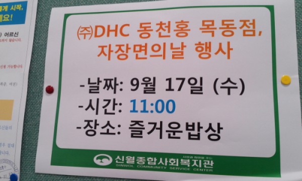 (주)디씨에이치 동천홍 목동점(대표 기성호)은 양천사랑복지재단(이사장 설종순)의 연계로 9월 17일, 신월종합사회복지관(관장 김동호) 경로식당 및 데이케어센터 이용자 어르신들께 짜장면 170인분을 무료로 대접하였습니다. 본 행사는 기존 분리되어 있던 신월6동 경로식당이 복지관 신축으로 통합되면서 2번(7, 9월)으로 나누어 계획된 행사의 일환으로 진행되었습니다.