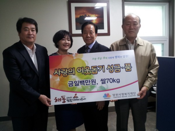 해동 황토 참숯가마 사우나(대표 정수경)는 양천사랑복지재단(이사장 설종순)의 연계로 9월 17일, 목1동 주민센터에 한가위 맞이 쌀 등 성금품(1,164,500원 상당)을 전달하였습니다. 풍성한 한가위에 이웃사랑 나눔실천에 동참해 주셔서 진심으로 감사드립니다.