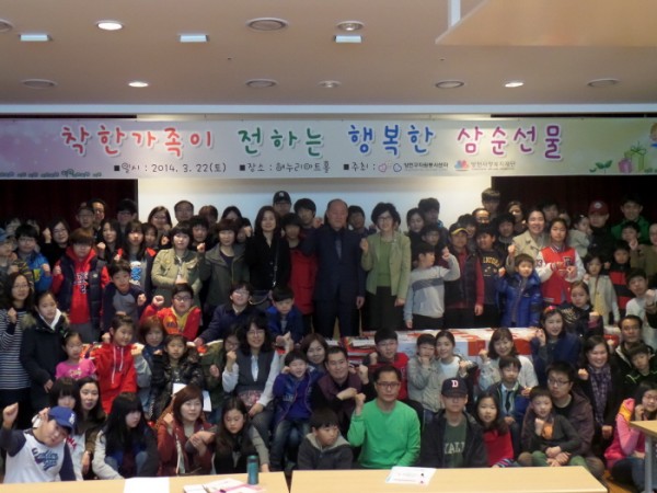 양천사랑복지재단(이사장 설종순)과 양천구자원봉사센터(소장 남궁금순)는 지난 3월 22일, 해누리타운 아트홀에서 가족 자원봉사자 100가구와 함께 「착한가족이 전하는 행복한 삼순선물」행사를 개최하였습니다.