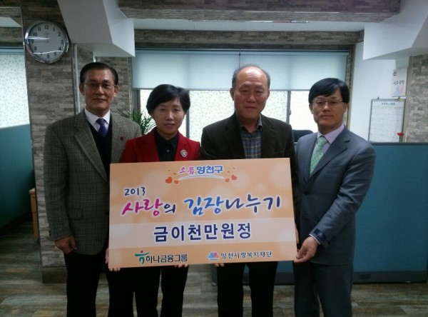하나금융그룹은 지난 12월 3일, 2013 사랑의 김장나누기 행사 후원금으로 금20,000,000원을 양천사랑복지재단(이사장 설종순)에 기부했습니다. 그룹을 대표하여 하나은행 신정동지점 오미라 지점장님이 전달식에 참석하셨습니다. 따뜻한 마음에 감사드리며, 앞으로도 우리 재단에 많은 관심과 성원을 부탁드립니다.