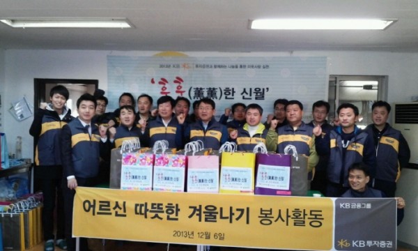 KB투자증권(사장 정회동)은 지난 12월 6일, 양천사랑복지재단(이사장 설종순)의 연계로 신월종합사회복지관(관장 김동호)과 함께 어르신 월동대비 나눔 봉사활동을 진행하였습니다. 봉사자들은 7개 조로 나뉘어, 약 50여 가구에 내의, 목도리, 수면양말 등 1인당 40,000원 상당의 방한용품을 전달하면서, 직원들이 직접 창문에 단열을 위한 에어캡 설치를 하였습니다. 어르신들의 따뜻한 겨울나기에 큰 도움이 되었기를 바라며, 동참해주신 KB투자증권 직원분들께 진심으로 감사드립니다.