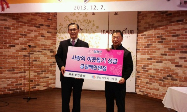 목동철인클럽(회장 나운삼)은 지난 12월 7일, 양천리더스클럽에서 열린 송년의 밤 행사에서 양천사랑복지재단(이사장 설종순)에 사랑의 이웃돕기 성금을 전달하였습니다. 이 날 기탁된 성금 약 1,000,000원은 목동철인 활동 점수가 모여 이루어진 것으로, 아동복지시설 2곳의 겨울철 난방비로 지원될 예정입니다. 따뜻한 기부에 감사드리며, 앞으로도 우리 재단에 많은 관심과 성원을 부탁드립니다.