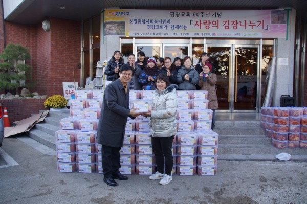 지난 11월 29일, 평광교회(담임목사 조성욱)는 개관 60주년을 맞이하여, 양천사랑복지재단(이사장 설종순)의 연계로, 신월종합사회복지관(관장 김동호)과 함께 사랑의 김장나누기 행사를 진행하였습니다. 이날 완성된 김치는 탈북주민가정, 다문화가정, 저소득가정 등의 1,000여가구에 잘 전달되었습니다. 추운날씨에도 따뜻한 사랑을 베풀어주신 모든 여러분들께 감사드립니다.