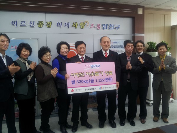 지난 12월 13일, 양천서예가협회(회장 조영자)는 양천구청에서 백미 520kg을 따뜻한 겨울보내기 성품으로 기탁하였습니다. 이는 제 16회 양천서예가협회전 개전식 축하 쌀 화환으로, 회원분들의 따뜻한 마음까지 그대로 잘 전달되었습니다. 진심으로 감사드립니다.