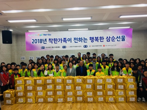 -3월- 착한 가족이 전하는 행복한 삼순선물 페이지 정보 작성자 양천사랑 작성일2018-04-02 15:00 조회735회 댓글0건 관련링크 이전글 다음글 목록 본문 \r\n3월 31일 토요일 착한가족이 전하는 행복한 삼순선물 행사가 진행됐습니다.양천구 관내 저소득 어르신 100분께 착한가족봉사단 50개의 팀이 직접 포장한 삼순선물세트와 손편지를 전달하였습니다.기뻐하실 어르신들을 생각하며 만드는 행복한 시간이 되었습니다. 댓글목록 등록된 댓글이 없습니다. 이전글 다음글 목록